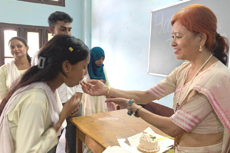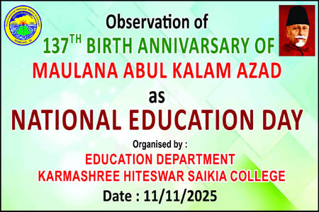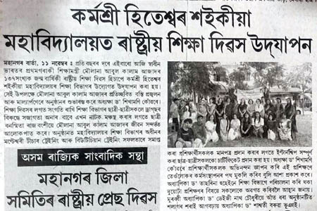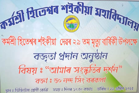 ছয়মাইলস্হিত কৰ্মশ্ৰী হিতেশবৰ শইকীয়া মহাবিদ্যালয়ত আজি(২২/০৪/২৫ তাৰিখে) অসমৰ প্ৰাক্তন মুখ্যমন্ত্ৰী প্ৰয়াত হিতেশ্বৰ শইকীয়া দেৱৰ ২৯তম মৃত্যু দিৱস উপলক্ষে "আমাৰ সংস্কৃতিৰ দৰ্শন" শীৰ্ষক এটি বক্তৃতানুষ্ঠান অনুষ্ঠিত হয় ৷ অনুষ্ঠানৰ আৰম্ভণিতে অসমৰ প্ৰয়াত মুখ্যমন্ত্ৰী হিতেশ্বৰ শইকীয়া দেৱৰ প্ৰতিচ্ছবিৰ সন্মুখত বন্তি প্ৰজ্বলন আৰু পুষ্পাঞ্জলি অৰ্পন কৰা হয় ৷ অধ্যক্ষা ড° শিখামণি কোঁৱৰে হিতেশ্বৰ শইকীয়াদেৱৰ বাল্যকাল , শিক্ষা জীৱন আৰু কৰ্মজীৱনৰ বিষয়ে এক চমু অৱলোকন আগবঢ়ায় ৷ বক্তৃতানুষ্ঠানৰ নিমন্ত্ৰিত বক্তা অগ্নি নিৰ্বাপক বিভাগৰ উপ সঞ্চালক , আৰক্ষী বিষয়া তথা সাহিত্যিক , প্ৰৱন্ধকাৰ ড° নন্দ সিং বৰকলাদেৱে "আমাৰ সংস্কৃতিৰ দৰ্শন" বিষয়টিত এক সাৱলীল বক্তৃতা প্ৰদান কৰে ৷ বক্তাগৰাকীয়ে মন্তব্য কৰে যে তেওঁ জীৱন আৰু জীৱিকাক কেতিয়াও একাকাৰ কৰা নাই কাৰণ জীৱন আৰু জীৱিকা একে নহয় ৷ "জীৱনত ৰং আৰু সৌন্দৰ্য আছে , কিন্তু জীৱিকাত আছে কৰ্তব্য , ঘৃণা আৰু সংঘৰ্ষ ৷" তেওঁ মন্তব্য কৰে ভাৰতীয় সংস্কৃতিক কৰ্ম সংস্কৃতিয়ে মহান কৰিছে ৷ অসমীয়া সংস্কৃতিও সংমিশ্ৰণ আৰু সমন্বয়ৰ সংস্কৃতি ৷ বিভিন্ন জাতি - জনগোষ্ঠীৰ মিলনেৰে অসমৰ বাৰেবৰণীয়া সংস্কৃতিয়ে ৰূপ লৈছে ৷ লগতে তেওঁ কয় যে ফুল হ'লে ফল হ'বই ৷ সেয়ে ছাত্ৰ-ছাত্ৰীয়ে ফুল হ'বলৈ যত্ন কৰা উচিত ৷ আজিৰ ছাত্ৰ-ছাত্ৰীয়ে নিজ চেষ্টা আৰু অধ্যৱসায়েৰে জ্ঞান লাভ কৰি নাম উজ্বলাব পাৰিলেহে প্ৰয়াত মুখ্যমন্ত্ৰী কৰ্মশ্ৰী হিতেশ্বৰ শইকীয়া দেৱৰ প্ৰতি সেৱা জনোৱা হ'ব ৷ অসমীয়া বিভাগৰ মুৰব্বী অধ্যাপিকা ড° কানন মেধি পাটগিৰীয়ে সমাজবাদত বিশ্বাসী প্ৰয়াত হিতেশ্বৰ শইকীয়া দেৱৰ ব্যক্তিত্বৰ বিষয়ে চমু বক্তব্য আগবঢ়ায়৷